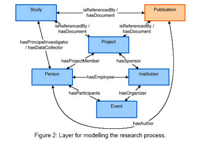 این لایه ( نگاه کنید به تصویر2 ) کل فرایند پژوهش را منعکس می کند و روابط بین همه موجودیت ها ( مانند اشخاص، سازمانها، برنامه های پژوهشی، طرح ها، نتایج، امکانات و توانمندیها، حق امتیازها) را نشان می دهد. بهر حال این لایه نشان دهنده چهار چوبی است که تحقیق در آن انجام و نتایج تحقیق حاصل شده است. این مدل بر اساس مدل هایی شبیه به استاندارد CERIF (قالب مشترک اطلاعات پژوهشی اروپا که توسط کمیسیون اروپا و CRIS ٍeuro توسعه داده شده یا هستی شناسی POLICY GRID بنا شده است. (CHORLEY & others, 2005) روابط موجود در این لایه، فرآیندهای استقرایی یا قیاسی را در حیطه پژوهش (برای مثال درباره نوشتن نتایج، برقراری پیوند نتایج به طرح ها، برقراری پیوند طرح های تکمیلی به برنامه های پژوهشی و غیره) فراهم می کند. از این روابط می توان برای کاوش اطلاعات مرتبط و طراحی هسته یک سیستم اطلاعاتی پژوهشی که به لایه های دیگر( در ادامه می ببینید ) متکی می باشند استفاده کرد.