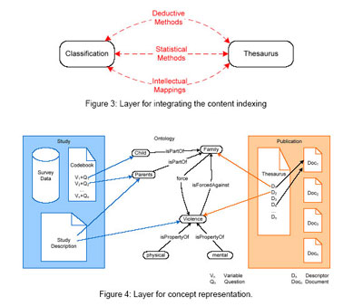 این لایه با معانی که از خود داده ها یا مدارک جایگزین ( فراداده های همراه شامل نمایه سازی محتوا با کلید واژها، نشانه های رده بندی و غیره ) برداشت می شوند ارتباط دارد. این لایه ناهمگونی بین واژگان نمایه سازی به کاررفته در مجموعه های مختلف و در قالب های مختلف اطلاعات مانند رده بندی ها و اصطلاحنامه های تولید شده برای انتشارات را بررسی می کند. ( نگاه کنید به تصویر 3 ).