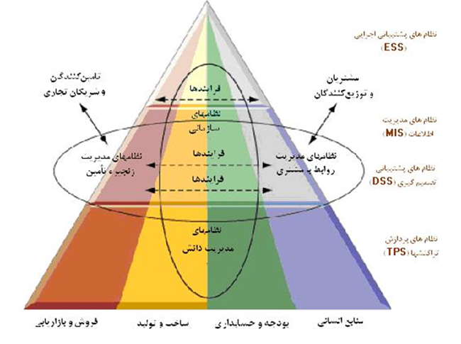 هرکدام از این چهار نظام اطلاعاتی در سطح سازمانی مخصوص به خود مورد بررسی قرار میگیرد: نظامهای پشتیبانی اجرایی در سطح راهبردی (مدیران ارشد)، نظامهای پشتیبانی تصمیمگیری و نظامهای اطلاعات مدیریت، در سطح مدیریتی (مدیران میانی)، و نظامهای پردازش تراکنش در سطح عملیاتی (مدیران پائینی). هر یک از سطوح نیز به چهار ناحیه عملکردی الف) منابع انسانی؛ ب) بودجه و حسابداری؛ ج) ساخت و تولید؛ و د) بازاریابی تقسیم میشوند (شکل شماره 1).