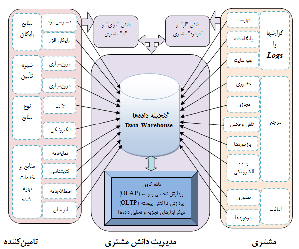 دانش "از" و "درباره" مشتری استخراج و توسط نرمافزارهایتحلیلی مورد ارزیابی و تجزیه و تحلیل واقع میشود. از فنون دادهکاوی بهمنظور آگاهی از گرایش کاربران/مشتریان به خدمات و منابع اطلاعاتی کتابخانهها و مراکز اطلاعرسانی و نیز انگیزه، رفتار و عملکرد آنها بهرهبرداری میشود. از فنون پردازش تحلیلی و تراکنش پیوسته نیز دادههای (مکعبهای [46]OLAP و پایگاههای داده رابطهای OLTP[47]) چند بعدی[48]استخراج میشود که بهمنظور تجزیه و تحلیل سریع یا زمانبر نتایج، مدلسازی فعالیتها و فرآیندها (ی کنونی و آینده) و برنامهریزی راهبردی در جهت تأمین نیازهای اطلاعاتی کاربران/مشتریان بهکار گرفته میشود.