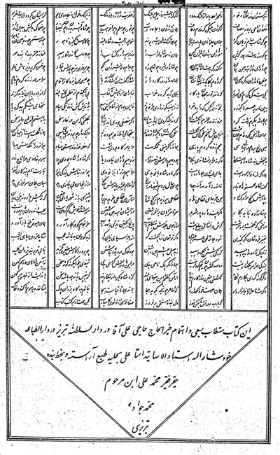 تبریز: کارخانه مشهدیحاج آقا بن آقا احمد تبریزی، به سعی و اهتمام کربلای تقی، ۱۲۷۵ ق