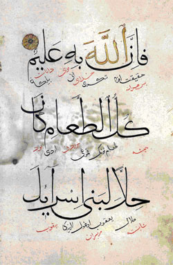 1- اعراب گذاری آن با قلم یک سوم (نسبت به متن اصلی ) انتخاب گردیده که می توان گفت خط، بیشتر جنبه محقَق پیدا کرده است تا ریحان. در اعراب گذاری، فتحه و کسره با شیب تند و ضمه، تشدید و جزم به اندازه نسبتا کوچکتر از حد متعارف نوشته شده و شاید دلیل آن متن ترجمه ترکی است که در ذیل متن اصلی آمده و بدین لحاظ پیش بینی مکانی بازتر برای ترجمه در نظر گرفته شده است.