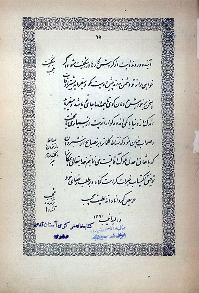 انجام: و پادشاه باید که آرزو برد بر حصول نام نیک و سعی نماید تامیت عدلش در آفاق منتشر شود.