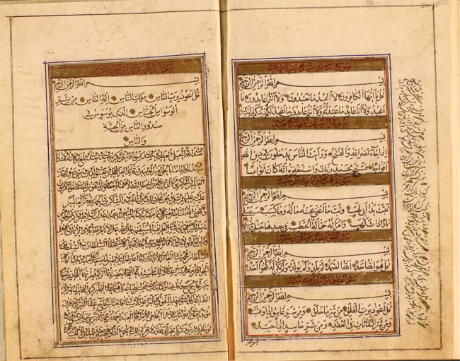 یادداشت: خط نسخ- حواشی شکسته نستعلیق؛ جلد تیماج؛ کاغذ فرنگی نخودی؛ آرایش در صفحه ماقبل افتتاح، نقش ترنج و سرترنج ترسیمی و چهار گوشه محرر که دعای قبل از تلاوت در آن نگارش یافته، دو صفحه افتتاح مذهّب و منقش و دوحاشیه حاشیه اول گل و برگهای زرین و الوان جداول الوان بین السطور این دوصفحه، فواصل آیات گوی زرین، اسامی سور به خط ثلث با سرخی در میان کتیبه منقش، جداول اوراق و کمند با زر و تحریر مشکی، در حواشی صفحات نشان استخاره، نام سوره، حزب، نصف، جزو با سرخی میان ترنج کوچک زرپوش و منقش و خواص سور و نکات تفسیری به خط شکسته نستعلیق بین السطور، برگ اول و دوم مرصّع متناظر با سرلوح زرپوش منقش، کتیبهسازی در صدر و ذیل، جدولکشی مضاعف و کمنداندازی، حاشیه تشعیری مذهّب است.
