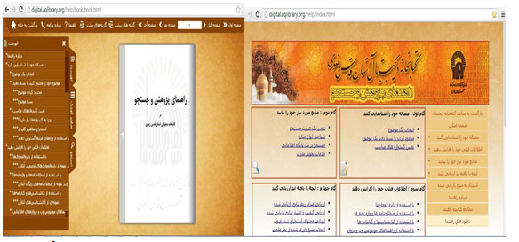 شکل 1. نسخه وبسایت (سمت راست) و نسخه نرمافزاری (سمت چپ) راهنمای پژوهش و جستجوی کتابخانه دیجیتال آستان قدس رضوی